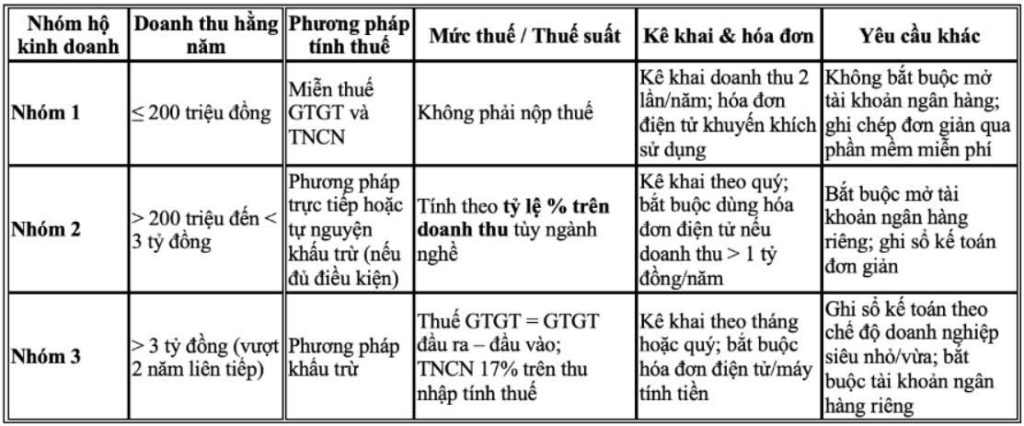 Đối với thuế giá trị gia tăng, các chủ thể nhóm này nộp theo phương pháp trực tiếp, tính theo tỷ lệ phần trăm trên doanh thu hoặc đăng ký tự nguyện theo phương pháp khấu trừ trong trường hợp đáp ứng đủ điều kiện. Mức thuế cụ thể theo phương pháp trực tiếp là 1% cho phân phối, cung cấp hàng hóa; 5% cho dịch vụ, xây dựng không bao thầu vật liệu; 3% cho sản xuất, vận tải, dịch vụ gắn với hàng hóa, xây dựng có bao thầu vật liệu và 2% cho hoạt động kinh doanh khác.